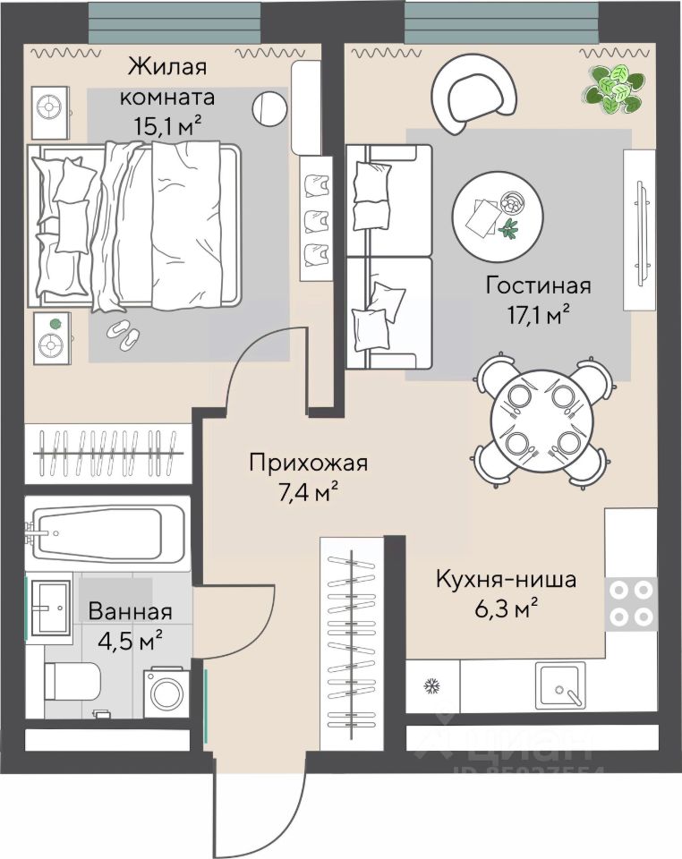 Продаётся 1-комнатная квартира в строящемся доме (Секции 2.3-2.4), срок сдачи: I-кв. 2028, общей площадью 50.4 кв.м., на 26 этаже.