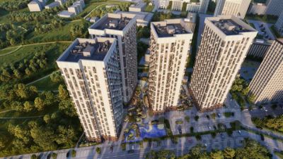 Квартал состоит из четырех 27-этажных домов. В домах — уютные студии, однокомнатные, двухкомнатные, семейные трехкомнатные квартиры. А для ценителей редких форматов квартиры с террасами. Парадный вестибюль с камином и кафе, двор с лаунж-зонами, фонтаном, сенсорным садом, детскими и спортивными площадками внутри.