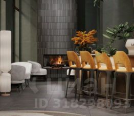Интерьер вестибюля с кофейней, камином и панорамными видами выполнен в благородных приглушенных тонах с авторским панно из мозаики.