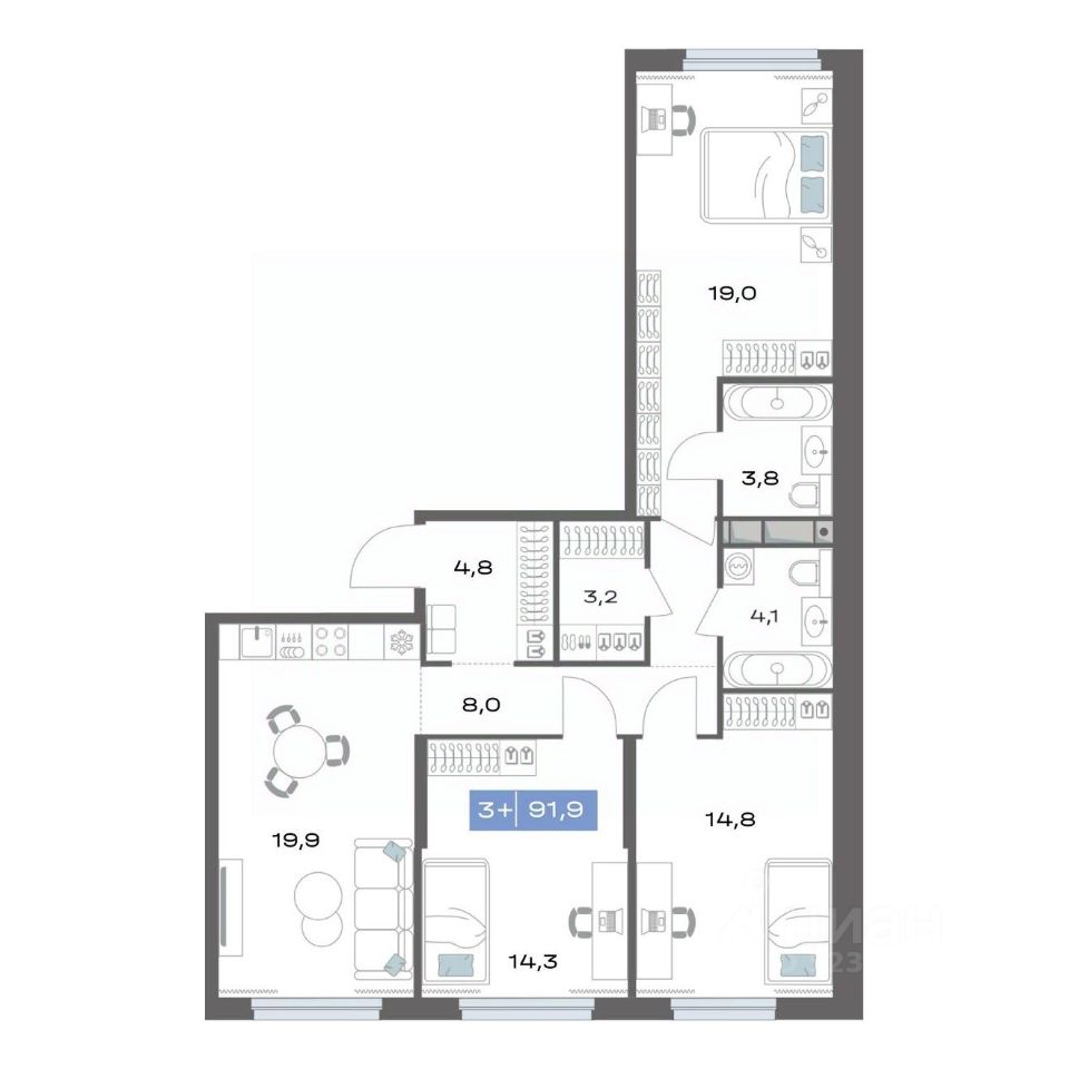 Продаётся 3-комнатная квартира в строящемся доме (Корпус 1.2), срок сдачи: III-кв. 2026, общей площадью 91.9 кв.м., на 5 этаже. Новый жилой комплекс "Толк Академический" от застройщика "СЗ Капитан" расположен по адресу: г. Екатеринбург, улица Академика Парина.