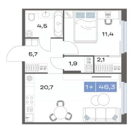 Продаётся 1-комнатная квартира в строящемся доме (Корпус 1.4), срок сдачи: III-кв. 2026, общей площадью 46.3 кв.м., на 3 этаже. Новый жилой комплекс "Толк Академический" от застройщика "СЗ Капитан" расположен по адресу: г. Екатеринбург, улица Академика Парина.
