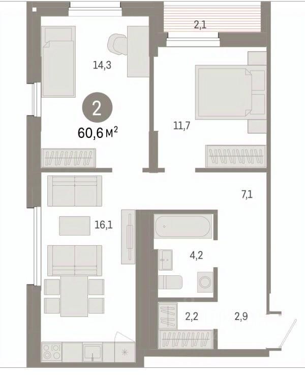 В продаже двухкомнатная квартира площадью 60,6 кв.м. в квартале "Депо", застройщик "Брусника".