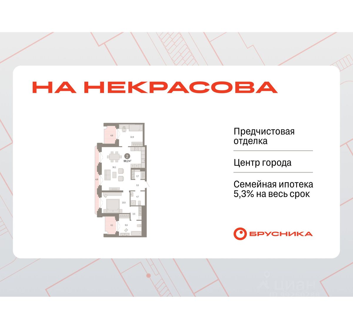 Квартира с кухней-гостиной и двумя спальнями в квартале "На Некрасова". Особенности планировки: второй санузел, гардеробная, окно в санузле, лоджия, разнесённые спальни, предчистовая отделка, мастер-спальня, балкон.