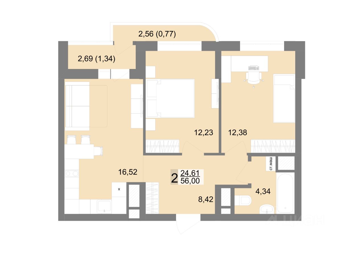 Продаётся 2-комнатная квартира в строящемся доме (Дом 1Д), срок сдачи: II-кв. 2027, общей площадью 56 кв.м., на 15 этаже. с Квартал расположен между двумя микрорайонами - Академический и Широкая речка на пересечении улиц Тенистая-Краснолесья-Соболева. Вы сможете пользоваться преимуществами сразу двух районов! 30 минут до центра города на машине, 9 минут до Объездной дороги, если хочется выехать на природу. В шаговой доступности есть несколько школ, детских садов и спортивных секций. А еще один детский сад на 350 мест уже построен на территории самого квартала. Большой двор, разделен на рекреационные зоны. Есть площадки для малышей и подростков с безопасным покрытием, зоны ворк-аута для предпочитающих здоровый образ жизни, прогулочные дорожки для бесед с друзьями или соседями. Безопасность - важное преимущество эко-квартала. Вход на территорию осуществляется с помощью Face ID или через мобильное приложение. Входные группы оформлены в соответствии с архитектурной концепцией всего квартала, ведь всегда приятно заходить в красиво оформленный подъезд. На всех этажах предусмотрена навигационная система, чтобы ваши гости точно не заблудились! В третьей очереди квартала "На Тенистой" есть несколько уникальных планировок, в том числе с мастер-спальнями, с открытыми балконами, с панорамным остеклением лоджии. А чтобы вы точно подобрали то, что по душе, в продаже представлены все виды комнатности - от студий до трехкомнатных. Мы за быстрый переезд, поэтому все квартиры сдаются с отделкой "под ключ": поклеены обои под покраску, постелен ламинат, установлены окна, обустроен санузел, поставлены счетчики, проведена разводка. До встречи на Тенистой. Здесь всегда хорошо! Окончание строительства: III квартал 2026г.