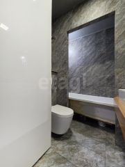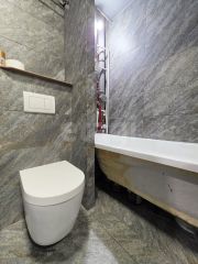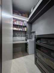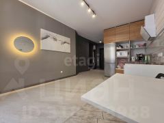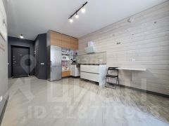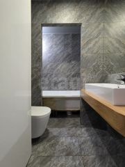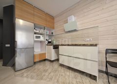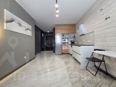 Кухня оборудована встроенной мебелью из натурального шпона и акрила с фурнитурой Blum, а также техникой, которая остается в квартире: холодильник, плита, вытяжка и микроволновка. Пол в кухонной зоне с подогревом, выложен кафелем. В спальне — вместительный шкаф-купе и диван-кровать. Санузел оснащен инсталляцией, врезной столешницей с большой раковиной, пеналом для хранения и местом под стиральную машину.