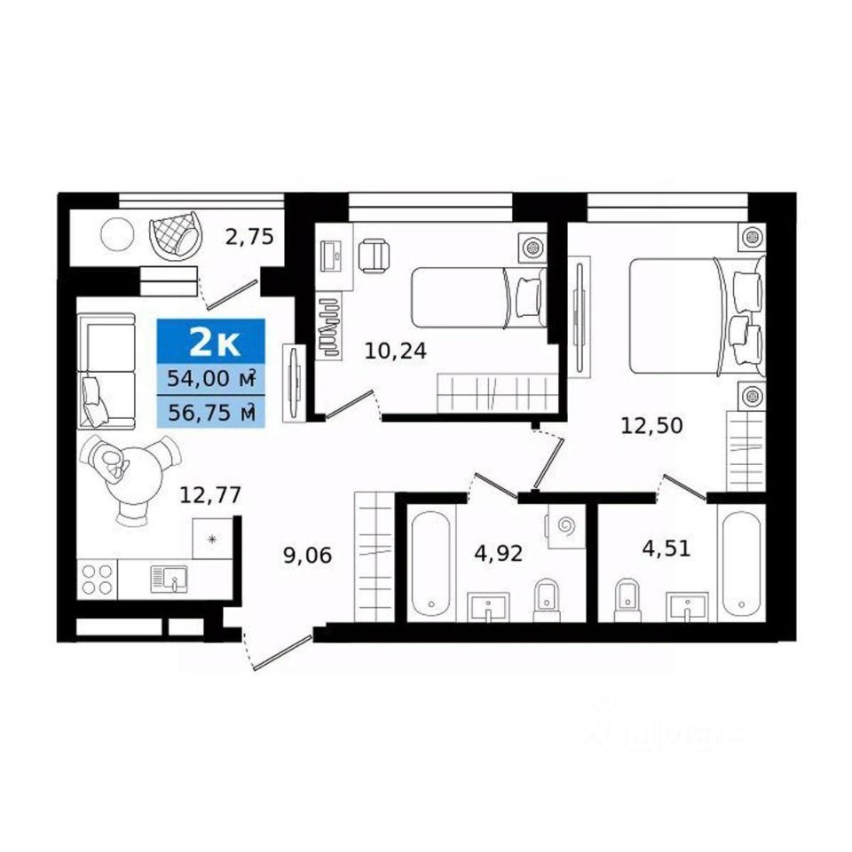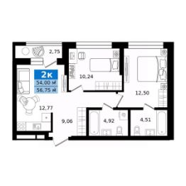 Общая площадь56,75 м²