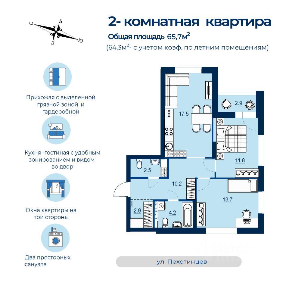 Продаётся 2-комнатная квартира в строящемся доме (Дом 1), срок сдачи: IV-кв. 2025, общей площадью 64.3 кв.м., на 21 этаже. Новый жилой комплекс "Estelle" от застройщика "СЗ Инвестстрой" расположен по адресу: г. Екатеринбург, улица Пехотинцев.