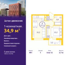 1-комн. квартира с предчистовой отделкой в ЖК "Астон.Движение" на 6 этаже. Общая площадь: 34.9 кв.м., жилая: 10.2 кв.м., площадь просторной кухни-столовой: 16.2 кв.м. Все окна выходят на одну сторону. В квартире один балкон, один совмещенный санузел. Высота потолков 2.7 м.