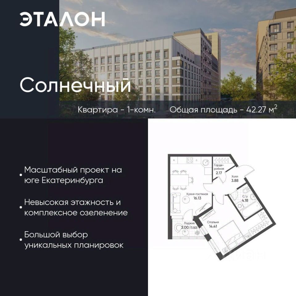 Продается квартира 230, по адресу ЖК "Солнечный", корпус Солнечный, корпус 6.2 в Солнечный на 14 этаже, с площадью 42.27 м2.