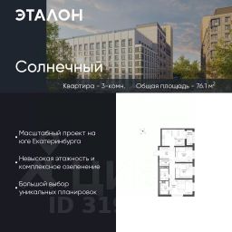 Продается квартира 250, по адресу ЖК "Солнечный", корпус Солнечный, блок 6.3 в Солнечный на 11 этаже, с площадью 76.1 м2.