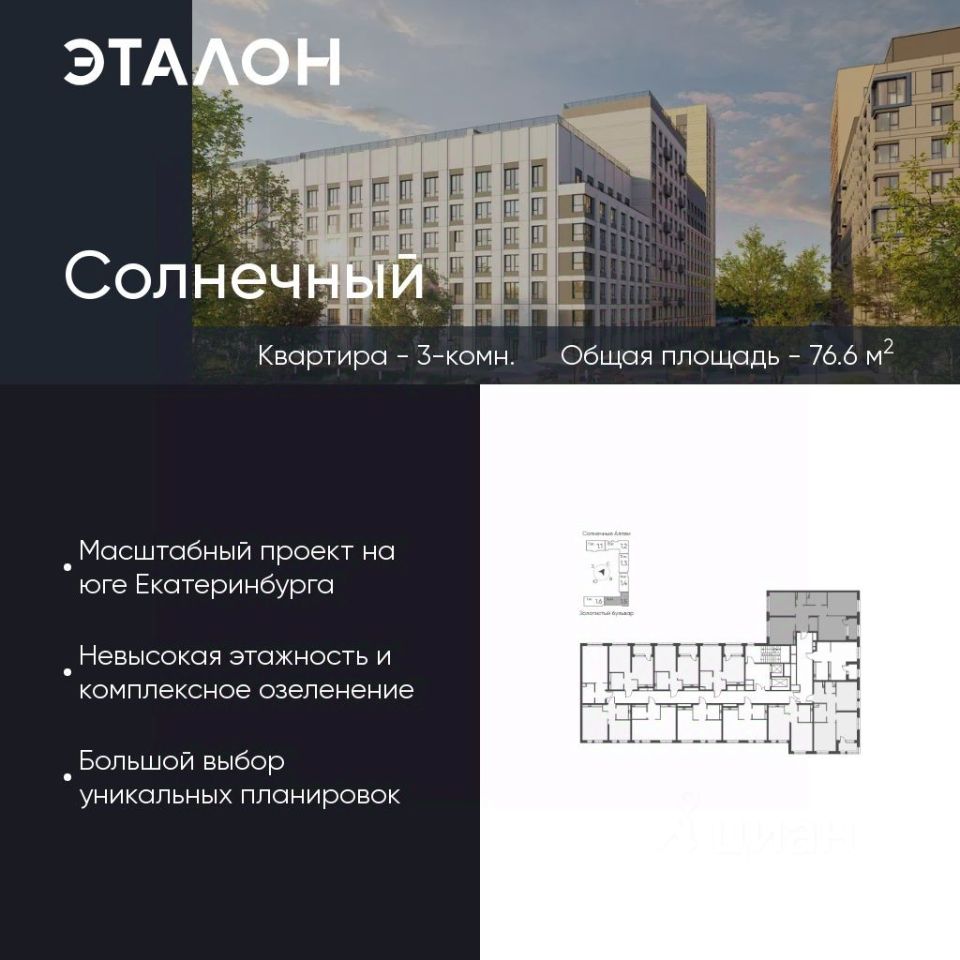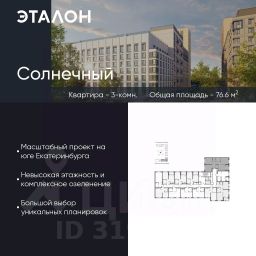 Продается квартира 332, по адресу ЖК "Солнечный", корпус Солнечный, блок 6.1 в Солнечный на 2 этаже, с площадью 76.6 м2.