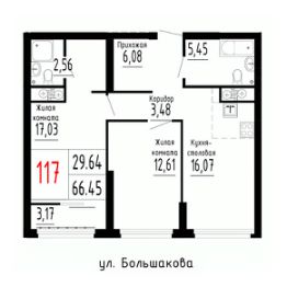 Продаётся 2-комнатная квартира в строящемся доме (Дом 1 секция 1), срок сдачи: II-кв. 2026, общей площадью 66.45 кв.м., на 17 этаже. Новый жилой комплекс "Лувр" от застройщика "СЗ Нижнеисетский пруд" расположен по адресу: г. Екатеринбург, улица Большакова.