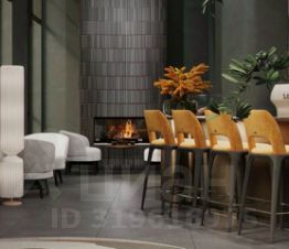 Интерьер вестибюля с кофейней, камином и панорамными видами выполнен в благородных приглушенных тонах с авторским панно из мозаики.