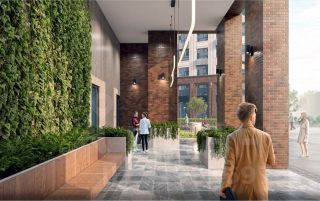 Квартал состоит из четырех 27-этажных домов. В домах — уютные студии, однокомнатные, двухкомнатные, семейные трехкомнатные квартиры. А для ценителей редких форматов квартиры с террасами. Парадный вестибюль с камином и кафе, двор с лаунж-зонами, фонтаном, сенсорным садом, детскими и спортивными площадками внутри.