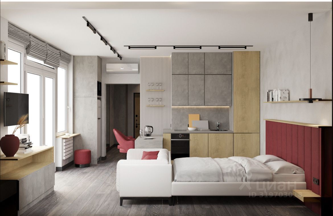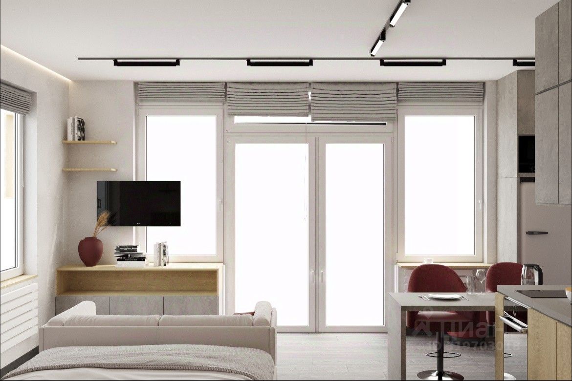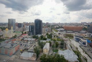 Просторная квартира студия, общей площадью 33.2 м2., распложена на высоком 19 этаже, где открывается шикарный вид на город! Окна квартиры выходят на разные стороны УГМК Арену и Свято-Троицкий Кафедральный Собор, панорамное остекление.