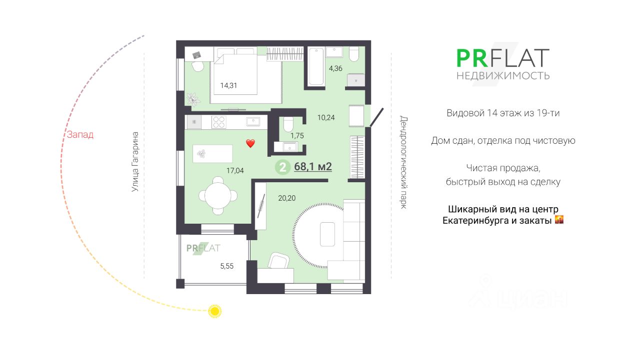 Квартира общей площадью 68,1 кв. м: просторная кухня-столовая - 17,1 кв. м, гостиная - 20,1 кв. м с выходом на лоджию (5,5 кв. м) и окнами в пол, уютная видовая спальня - 14,31 кв. м, функциональный коридор с прихожей - 10,33 кв. м, совмещенный санузел - 4,3 кв. м, гостевой санузел - 1,75 кв. м, который легко переоборудовать под гардероб. Высота потолков - 2,7 м.