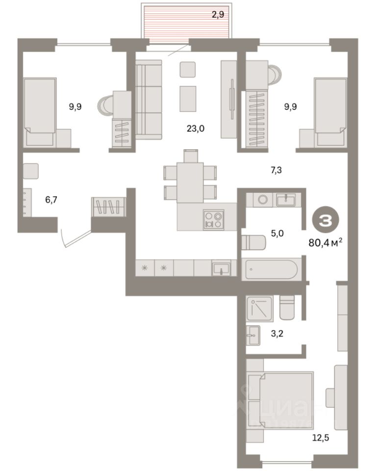Квартира с кухней-гостиной и тремя спальнями в квартале "Депо". Особенности планировки: второй санузел, вид во двор, разнесённые спальни, предчистовая отделка, мастер-спальня, балкон.