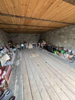 Гараж. Отдельно стоящее здание площадью 28 м2 (7 м на 4 м). Заливной фундамент, пол - бетон/дерево, материал стен - бетонный блок, перекрытия железобетонные, обшитые деревом, крыша покрыта шифером. Есть вместительный чердак и овощная яма.