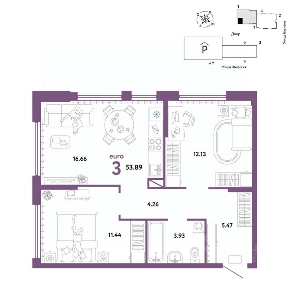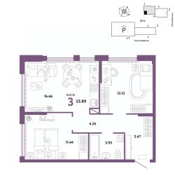 Продается 3комнатная квартира на 11 этаже от застройщика Страна Девелопмент. Площадь квартиры 53,89 кв. м. Стоимость указана без учета акций.