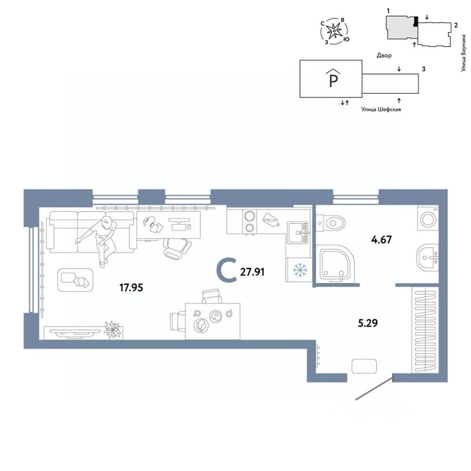 Продается студия на 19 этаже от застройщика Страна Девелопмент. Площадь квартиры 27,91 кв. м. Стоимость указана без учета акций.