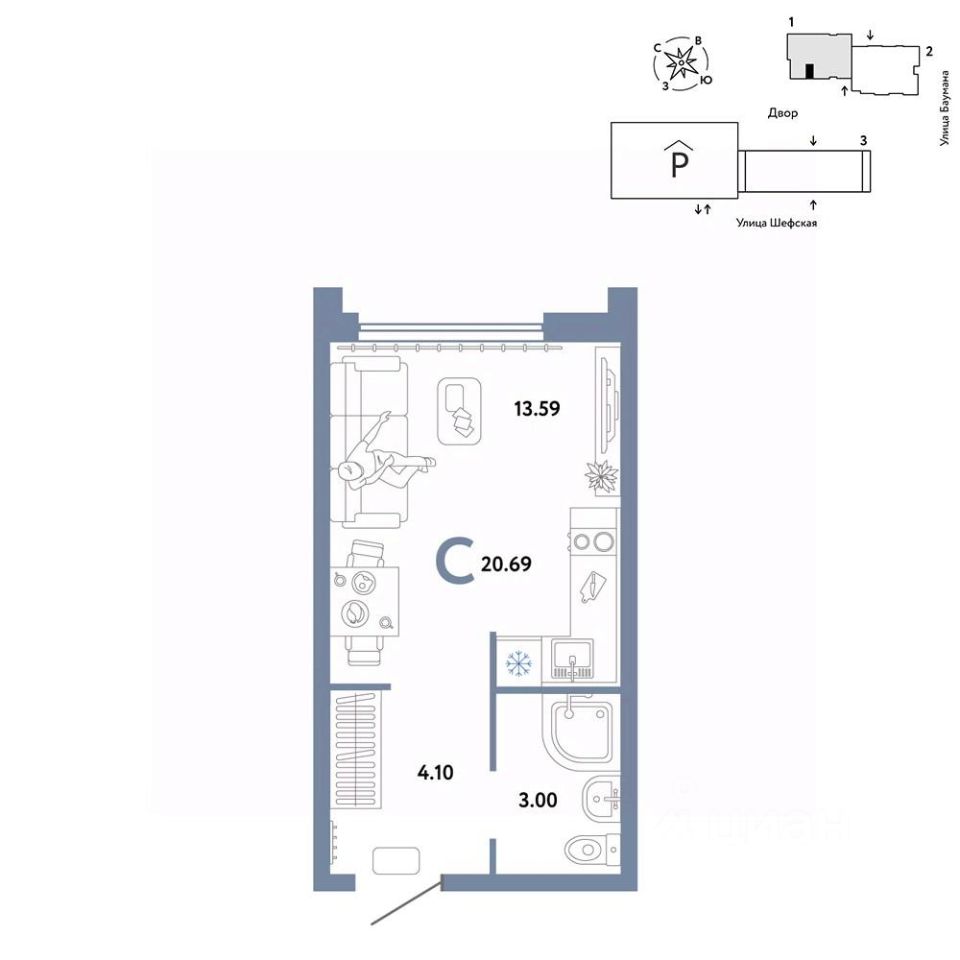 Продается студия на 22 этаже от застройщика Страна Девелопмент. Площадь квартиры 20,69 кв. м. Стоимость указана без учета акций.