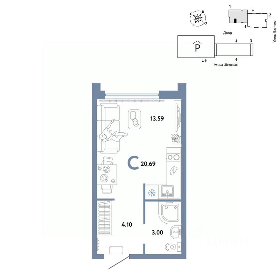 Продается студия на 24 этаже от застройщика Страна Девелопмент. Площадь квартиры 20,69 кв. м. Стоимость указана без учета акций.