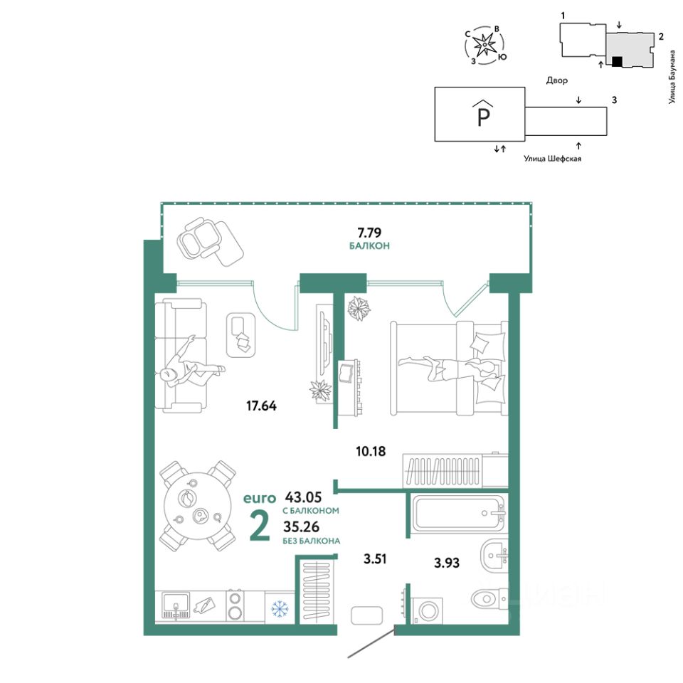 Продается 2комнатная квартира на 9 этаже от застройщика Страна Девелопмент. Площадь квартиры 43,05 кв. м. Стоимость указана без учета акций.