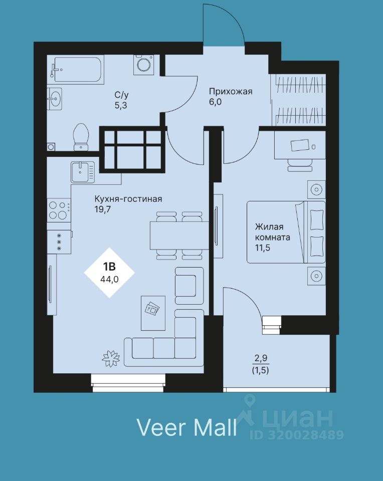 Площадь: 45,4 м² (включая лоджию 2,9 м²).