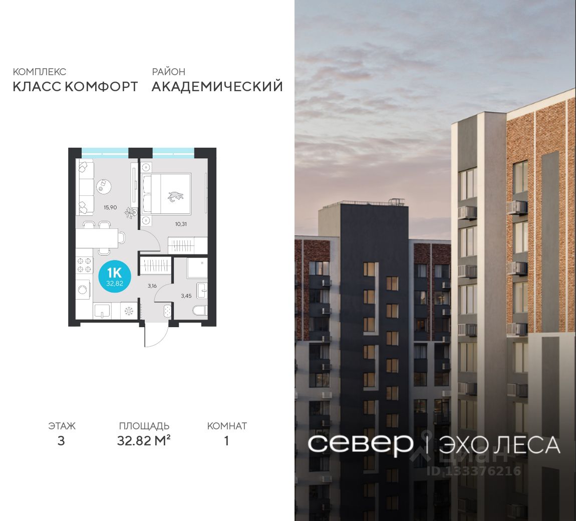 Продаётся квартира площадью 32.82 м2 в жилом комплексе "Эхо леса".