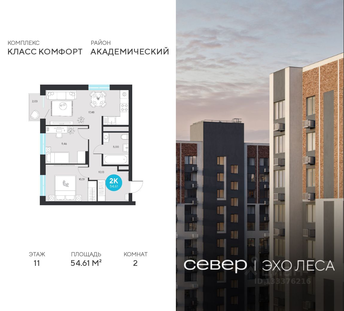 Продаётся квартира площадью 54.61 м2 в жилом комплексе "Эхо леса".