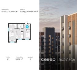 Продаётся квартира площадью 58.52 м2 в жилом комплексе "Эхо леса".