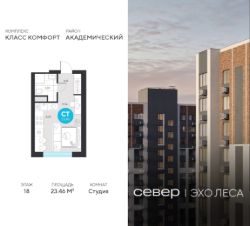 Продаётся квартира площадью 23.46 м2 в жилом комплексе "Эхо леса". Квартира находится на 18 этаже, жилая площадь квартиры 11.54 м2, площадь кухни-ниши — 5 м2.