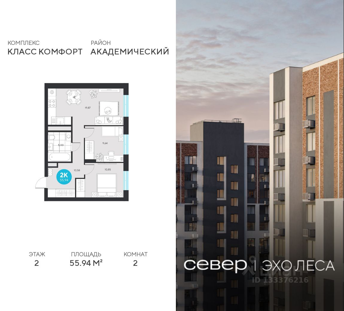Продаётся квартира площадью 55.94 м2 в жилом комплексе "Эхо леса".
