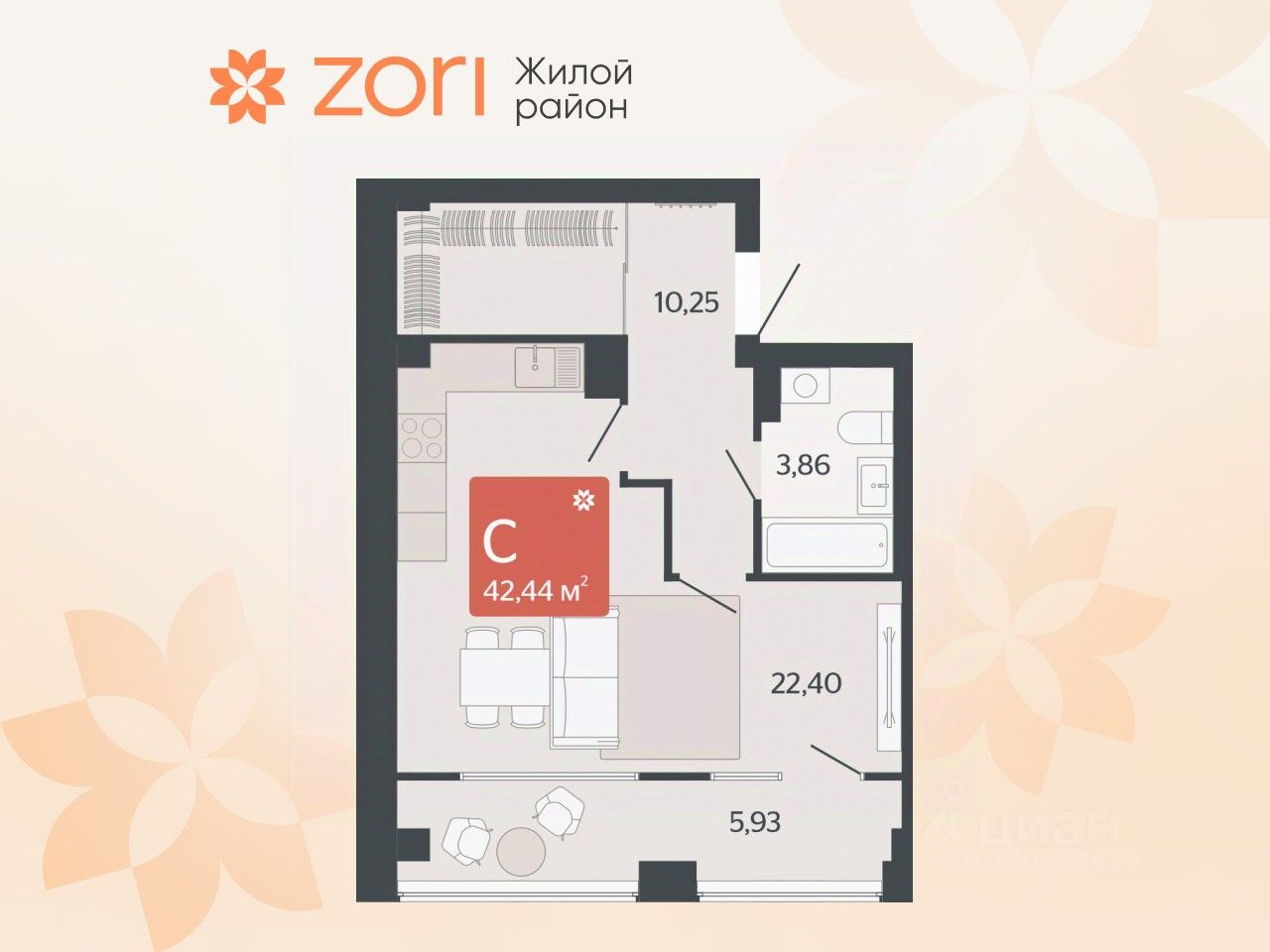 Общая площадь42,44 м²