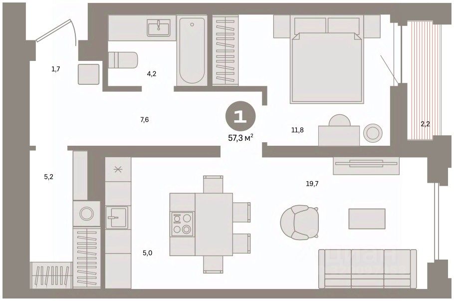 Квартира с кухней-гостиной и одной спальней в Южных кварталах. Особенности планировки: гардеробная, лоджия, предчистовая отделка.