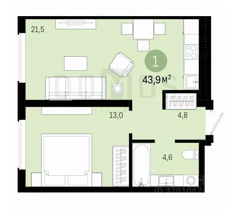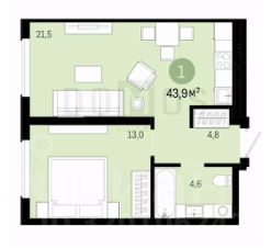 Планировка включает в себя кухню-гостиную, отдельную спальню и ванную комнату.