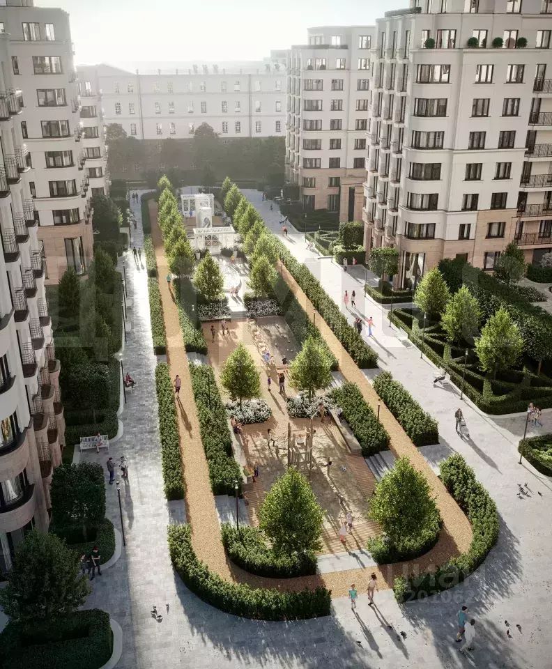 В квартале предусмотрена пешеходная аллея с фонтаном, перголами и местами для отдыха и занятий спортом.
