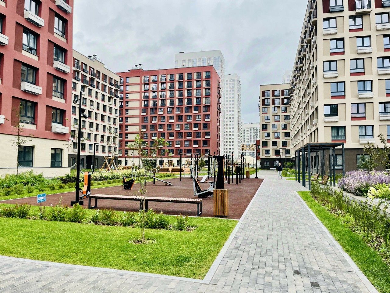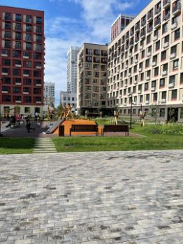 Очень красивый двор с ландшафтным дизайном, несколько детских зон и зона для занятий спортом с атравматическим