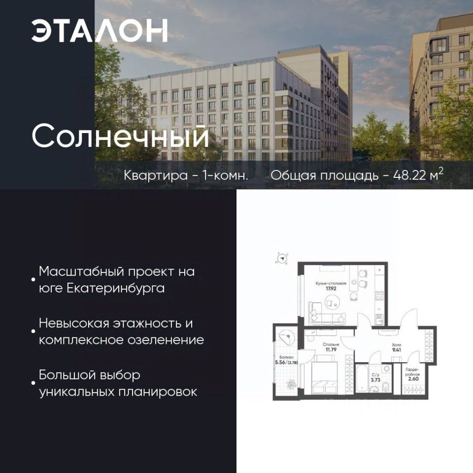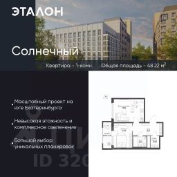 Продается квартира 311, по адресу Свердловская обл., г. Екатеринбург, Чкаловский район, корпус Солнечный, корпус 6.2 в Солнечный на 14 этаже, с площадью 48.22 м2.