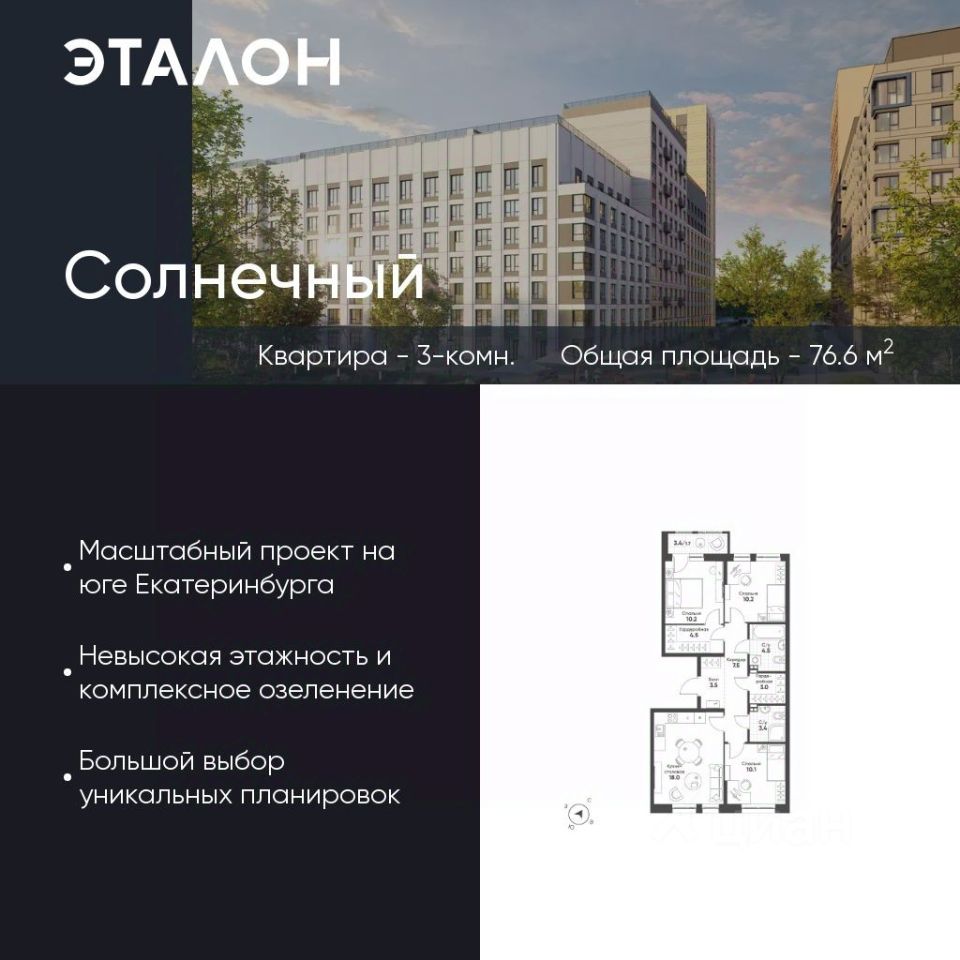 Продается квартира 660, по адресу Свердловская область, г. Екатеринбург, корпус Солнечный, блок 6.4 в Солнечный на 7 этаже, с площадью 76.6 м2.