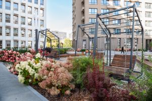 Особое внимание в проекте уделено внутреннему дворовому пространству: во дворе выполнен ландшафтный дизайн с оригинальными клумбами, деревьями, кустарниками и вечерней подсветкой. Безопасность домов обеспечивают камеры наблюдения, расположенные по периметру зданий, в местах общего пользования, на этажах и лифтах.