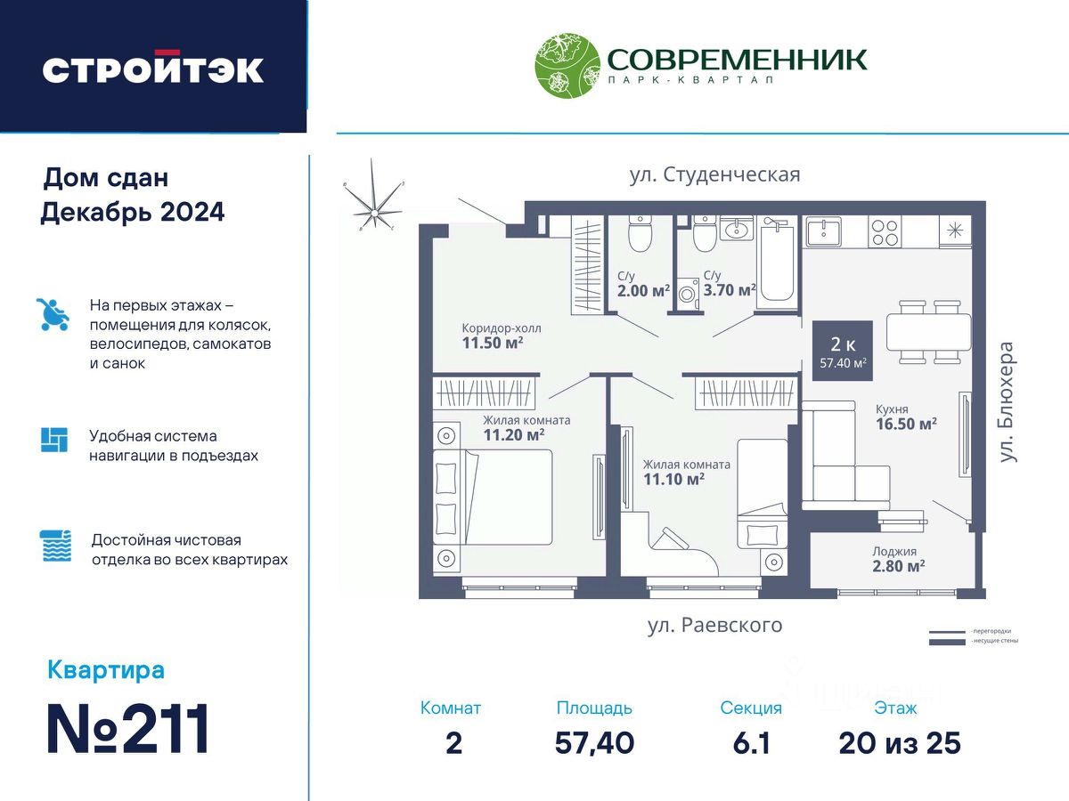 Жилой комплекс "Современник-6 дом" (секция 6.1) "Современник" — жилой квартал из 8 очередей строительства, расположенный на пересечении улиц Блюхера, Раевского, Комвузовской и Студенческой. Шестая очередь строительства включает 2 отдельных дома в глубине квартала. Дома сданы. Продажа квартир осуществляется по договору купли-продажи от застройщика. Сердце комплекса — ландшафтный парк площадью 1 гектар, оборудованный прогулочными маршрутами и детскими площадками. В 10 минутах на машине проспект Ленина, в пешей доступности — Шарташский лесопарк. Здесь вы можете приобрести машино-места в подземном паркинге и келлеры — кладовые комнаты. Кроме того, чистовая отделка в квартирах этой очереди выполнена по улучшенному стандарту "Комфорт +" с применением более функциональных и престижных материалов и решений. Район Кировский район — вблизи от динамичного центра, при этом в "Современнике" — своя атмосфера уюта и комфорта. Рядом с домом — лесопарк с озером Шарташ. Вблизи 5 школ, 3 детских сада и 3 вуза В пешей доступности Центр футбольной подготовки, фитнес-клубы и спортивный комбинат "Урал" "Пятёрочка", "Магнит" и "Перекрёсток" — в нескольких минутах ходьбы До торговых центров "Современник", "Апельсин" и "Парк Хаус" — 5-10 минут на машине Неподалёку — Дендрологический и Основинский парки, а также парк имени Блюхера Двор В ландшафтном парке кроме детских площадок вас ждут спортплощадки для футбола и стритбола, воркаут-комплекс и даже крытый деревянный амфитеатр для праздников или отдыха в жаркую погоду. Но это не всё. Закрытая территория с охраной Двор без машин, можно заехать только для погрузки-разгрузки Круглосуточное видеонаблюдение Подземный паркинг с машиноместами разной площади и доступом на лифте из подъезда Освещение всей территории парка-квартала Подъезд Доступ в подъезд на уровне земли — без барьеров Домофоны — в тёплых остеклённых тамбурах Удобная система навигации Помещения для колясок и самокатов на 1 этаже Сквозной вход — с внешней стороны улицы и со двора Планировки Объединённые кухни-гостиные для простора 3D-модели с вариантами обстановки Отказ от бесполезных "мёртвых" зон Отделка Улучшенный стандарт отделки "Комфорт +" На полу в комнатах, прихожих и кухнях ламинат 33 класса повышенной прочности, в ванной и туалете - плитка, на стенах виниловые обои на флизелиновой основе, потолки в комнатах, лоджиях и кухнях окрашенные, в коридорах, прихожих и санузлах натяжные Двухкамерные стеклопакеты с приточными клапанами вентиляции и детскими замками Оконные стёкла Energy light с покрытием из соединений серебра — минимум тепловых потерь, защита от вредного излучения и лучшая освещённость Межкомнатные двери и плинтусы белого цвета, усиленная сейф-дверь на входе в квартиру В санузлах установлены раковины и унитазы, а во всей квартире — розетки и выключатели Радиаторы с терморегуляторами и горизонтальной разводкой Приборы учета электроэнергии, отопления и водоснабжения