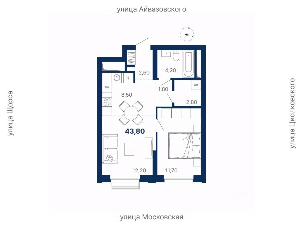 Общая площадь43,8 м²