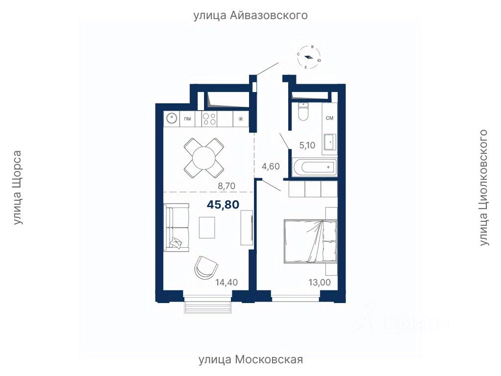 Общая площадь45,8 м²