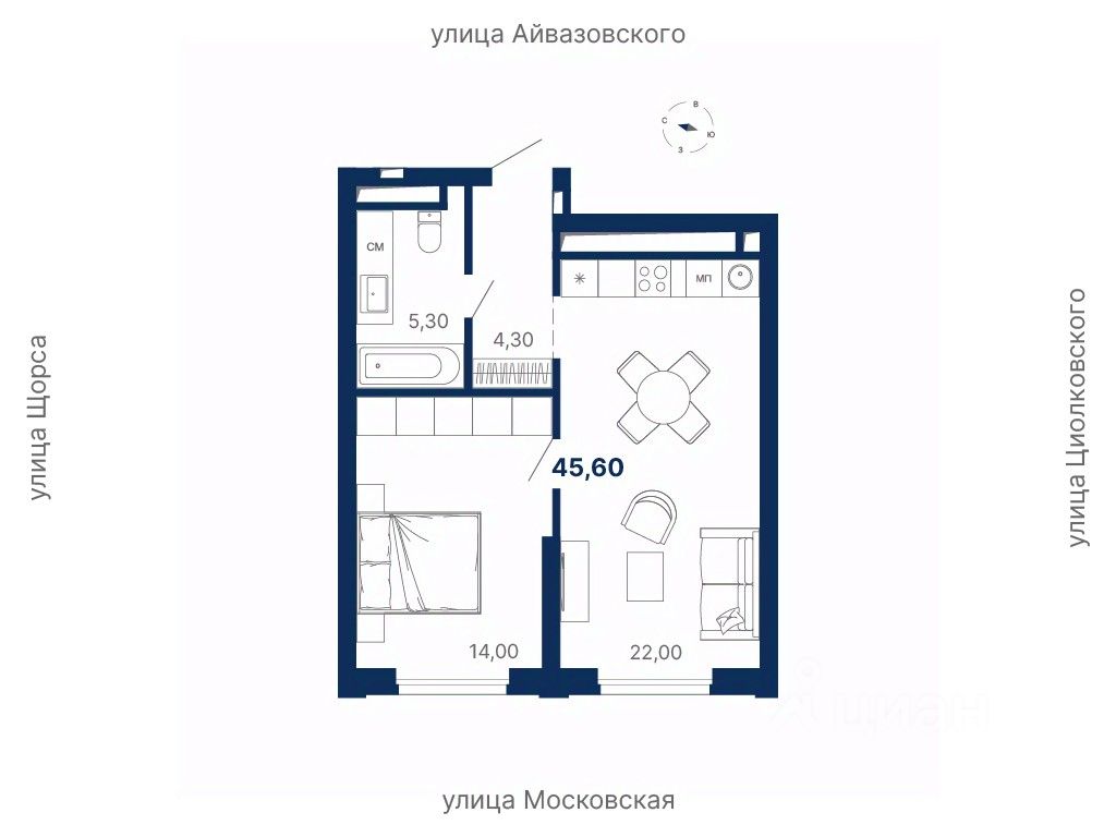 Общая площадь45,6 м²