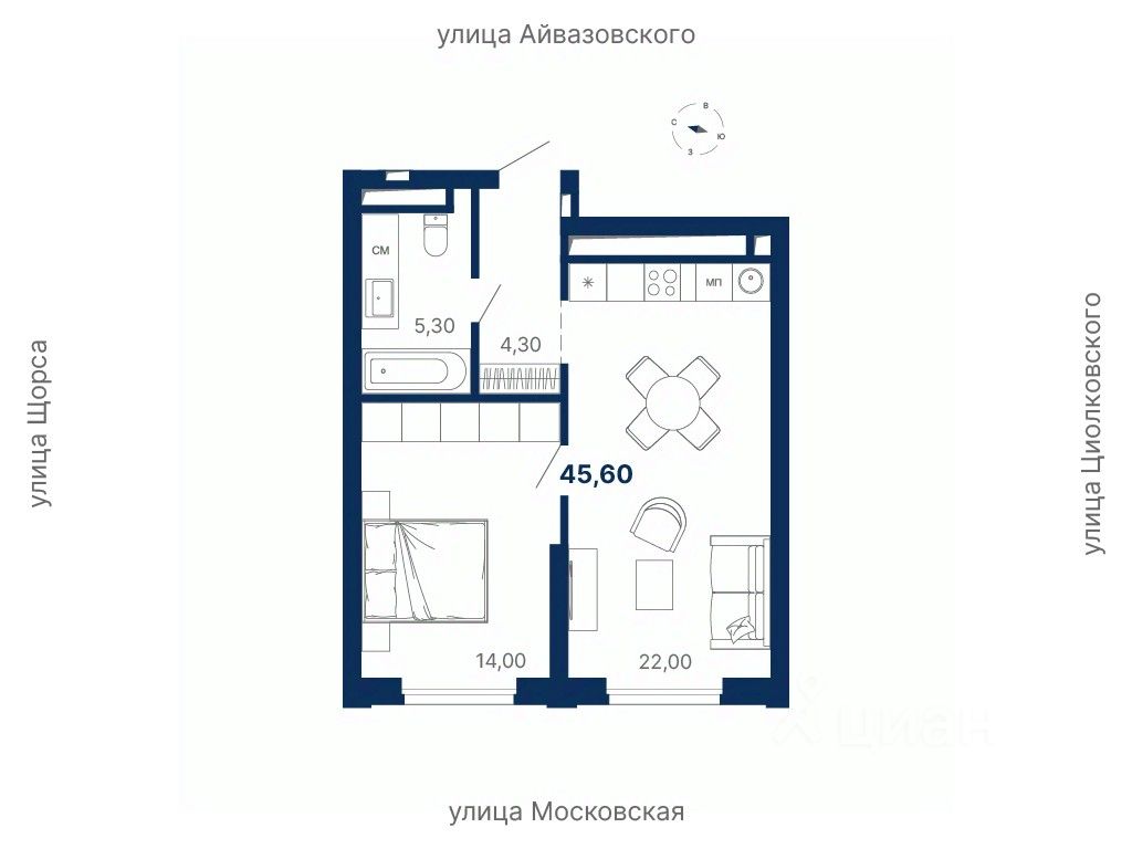 Общая площадь45,6 м²