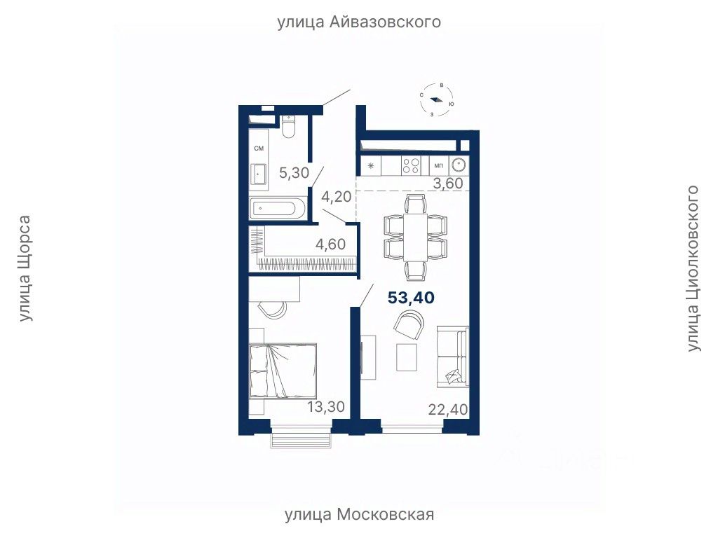 Общая площадь53,4 м²