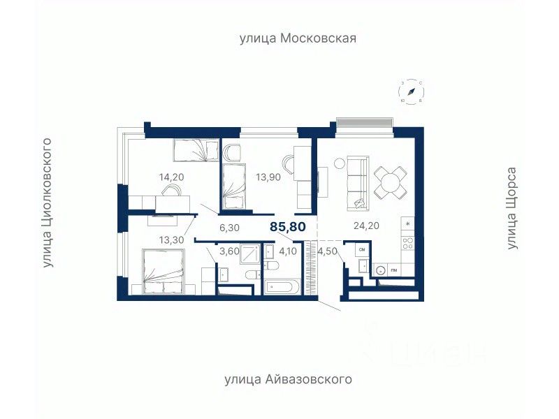 Локация — между ул. Московская, Щорса, Айвазовского и Циолковского, в шаговой доступности от метро Чкаловская.