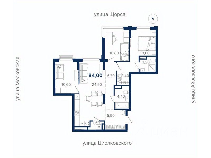 Локация — между ул. Московская, Щорса, Айвазовского и Циолковского, в шаговой доступности от метро Чкаловская.