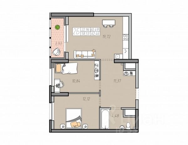 Продаётся 2-комнатная квартира в сданном доме (Печатников, 5 (Дом 1)), срок сдачи: IV-кв. 2024, общей площадью 60.495 кв.м., на 22 этаже.